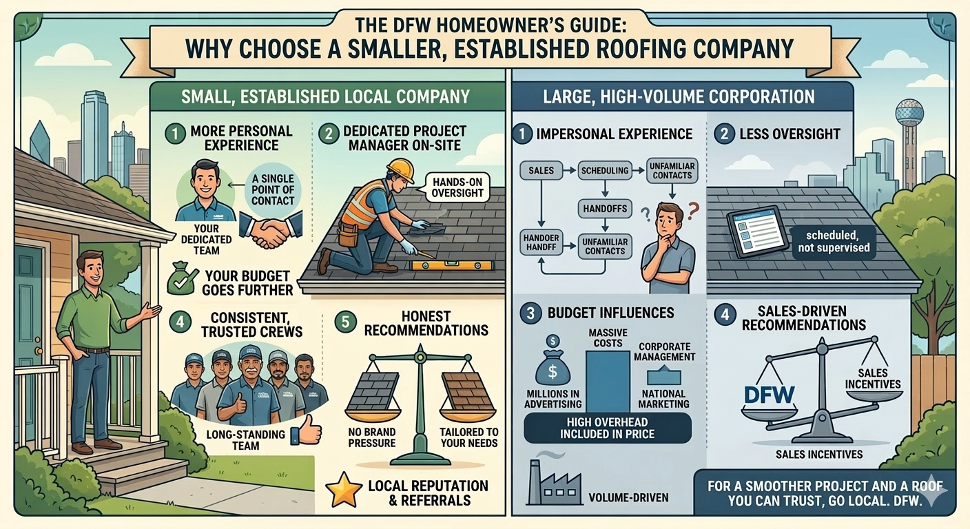 Why DFW Homeowners Often Benefit from Hiring a Smaller, Established Roofing Company When it’s time to replace your roof, homeowners in the Dallas–Fort Worth area are often faced with a choice: hire a large, high-volume roofing company or work with a smaller, well-established local contractor. While large companies can seem appealing because of their size and marketing presence, many homeowners are surprised to learn that smaller roofing companies often provide a better overall experience, better value, and more personalized service. Here are a few key reasons why many DFW homeowners choose to work with a smaller, established roofing company. ________________________________________ A More Personal Experience One of the biggest advantages of working with a smaller roofing company is the personal level of attention you receive throughout the project. Large companies often operate like assembly lines. Sales representatives sign contracts, projects are handed off to scheduling departments, and homeowners may never see the same person twice. With a smaller company, the experience is much more personal. You typically work with the same team from start to finish , and communication is direct and clear. Questions get answered quickly, and concerns are addressed by people who are personally invested in the outcome of the project. For many homeowners, this level of communication and accessibility provides peace of mind during a major home improvement project. ________________________________________ A Dedicated Project Manager On-Site Roof replacement is not just about installing shingles—it involves multiple steps that all need to be done correctly. These stages include: • Protecting landscaping and property • Removing the old roof • Inspecting the decking • Installing underlayment and ventilation • Proper shingle installation • Final cleanup and inspection (exterior and attic) Smaller companies often assign a project manager who is physically present on the job site and checking each phase of the installation as opposed to a sales person who understands selling but knows very little about roof installations. This oversight helps ensure that: • The work is completed according to manufacturer specifications & code requirements • The crew maintains quality workmanship • Any unexpected issues are addressed immediately For homeowners, this means the project is carefully supervised rather than simply scheduled and left unattended (or attended by someone who is not properly trained). ________________________________________ Your Budget Goes Further Large roofing companies often spend millions of dollars on advertising & large office spaces , especially if they’re quietly owned by in investment firm. Those costs don’t disappear—they are built into the price of every roof they install. Smaller companies typically operate with lower overhead and minimal advertising expenses , which allows them to stretch your dollars much further. Instead of paying for billboards, television commercials, and massive marketing campaigns, homeowners are paying primarily for: • Quality materials • Skilled labor • Proper installation In many cases, homeowners receive the same or better roofing system for a more efficient investment. ________________________________________ Honest Recommendations Without Brand Pressure Many large roofing companies have volume agreements with specific manufacturers. These agreements often include incentives for installing certain products or brands in high quantities. While these materials can still be good products, the recommendations homeowners receive may be influenced by those incentives. Smaller, established companies are often more flexible. Instead of pushing a particular brand for volume bonuses, they can focus on what best fits the homeowner’s needs and style preferences while still obtaining extended warranties if it makes sense. That means homeowners receive objective recommendations rather than sales-driven decisions . ________________________________________ Consistent, Trusted Crews Another difference homeowners notice is the consistency of the installation crew. Large companies often manage dozens—or even hundreds—of projects simultaneously. Because of this, their sub-contractors may be assigned based simply on availability. With a smaller roofing company, the crews are usually long-standing teams that the company trusts and works with regularly. This means homeowners are more likely to receive: • Experienced installers • Crews familiar with the company’s quality standards • Workers who take pride in the finished result Consistency leads to better craftsmanship and smoother projects. ________________________________________ Reputation Matters More For smaller local companies, reputation is everything. They rely heavily on word-of-mouth referrals, local relationships, and online reviews to grow their business. Every project matters because each satisfied homeowner can lead to future referrals. Large volume companies may rely more heavily on advertising pipelines and lead generation systems, while smaller companies depend on earning trust one project at a time. For homeowners, this often translates into a company that is highly motivated to deliver exceptional service. ________________________________________ The Bottom Line A roof replacement is a major investment in your home, and choosing the right contractor can make all the difference. While large roofing companies may dominate the advertising landscape, smaller, established local companies often provide: • A more personal customer experience • On-site project management and oversight • Better value due to lower overhead • Honest product recommendations • Consistent, trusted crews For many homeowners across Dallas–Fort Worth, that combination leads to a smoother project and a roof they can trust for years to come. ________________________________________ If you are